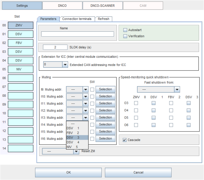 In the figure, input IN9 on the central module would mute the DSV 4 Speed Module. Muting can also be carried out via the central module's software: