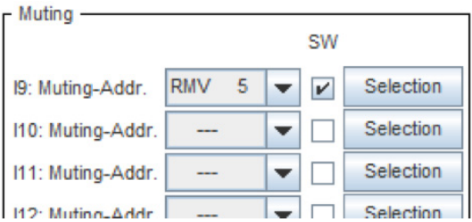 Muting is performed via inputs I9 to I16 of the central module or via the software.
